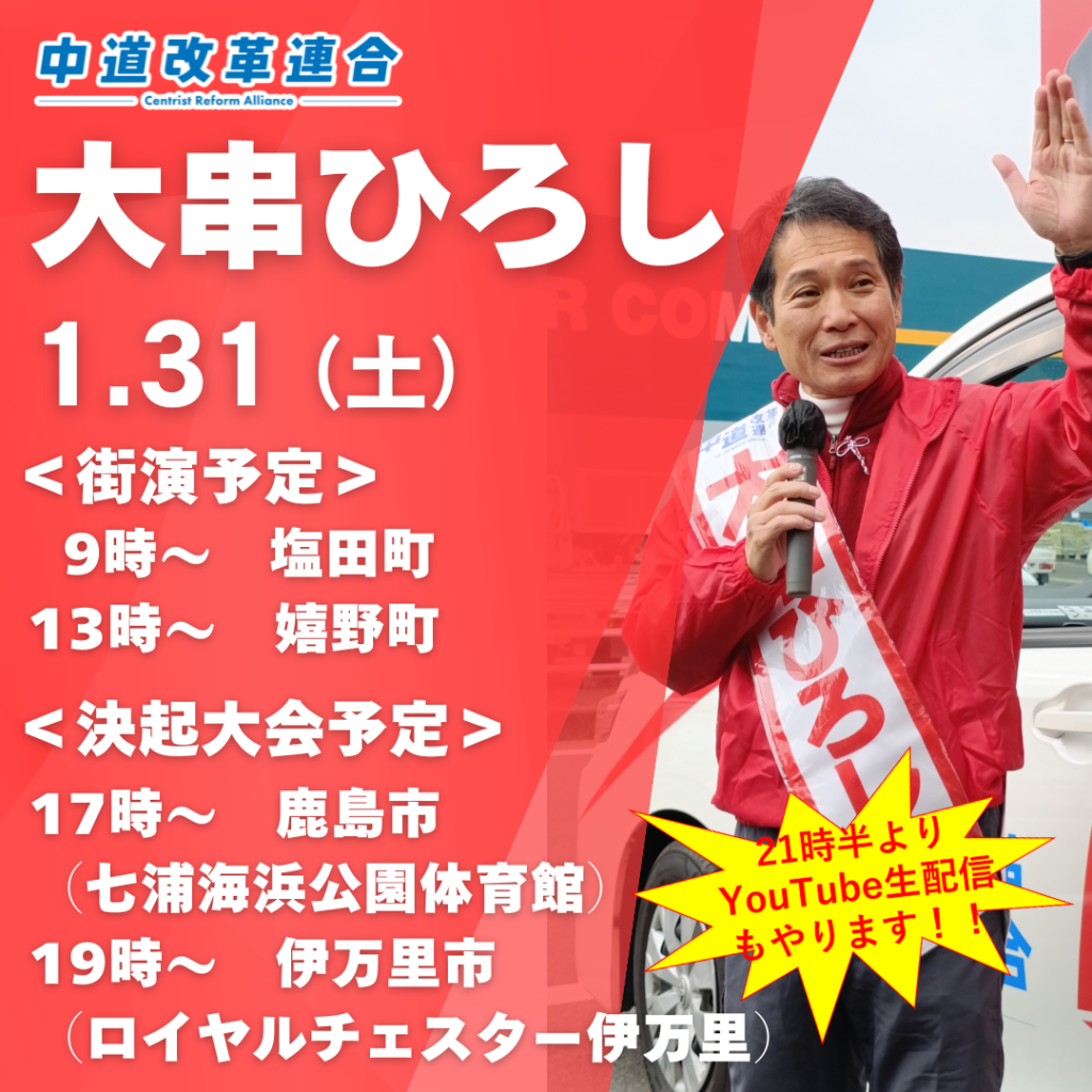 大串ひろしの本日予定 1/31(土) <街演予定> 9時~ 塩田町 13時~ 嬉野町 <決起大会> 17時 鹿島市七浦海浜公園体育館【Youtube生配信】 19時 イマリ市 ロイヤルチェスター伊万里【Youtube生配信】 <大串ひろし生配信> 21時半 【Youtube生配信】 -