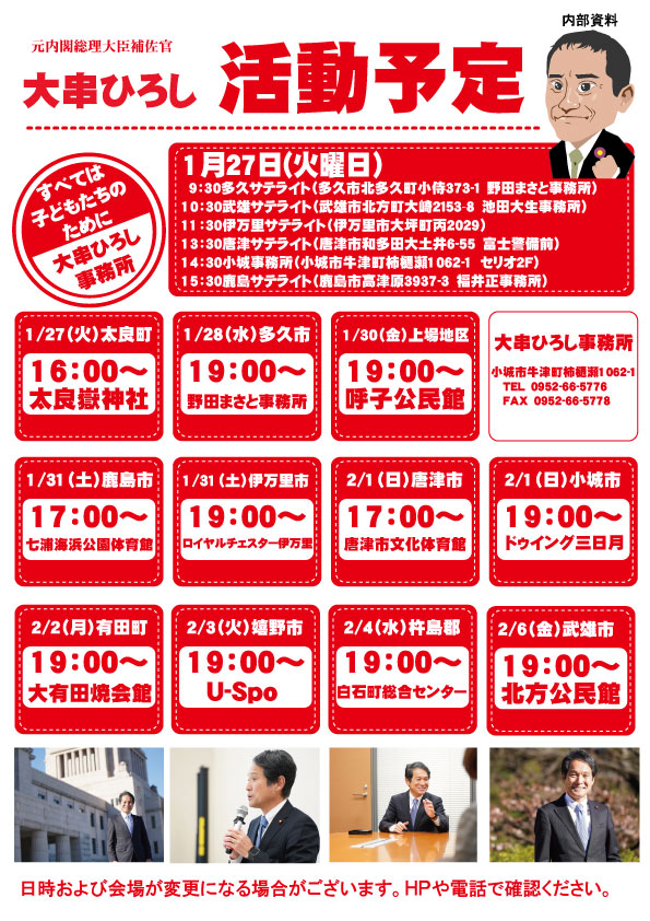 大串ひろし 総決起大会日程 1/27(火) 16:00 太良町・太良嶽神社 1/28(水) 19:00 多久市・野田まさと事務所 1/30(金) 19:00 上場地区・呼子公民館 1/31(土) 17:00 鹿島市・七浦海浜公園体育館 1/31(土) 19:00 伊万里市・ロイヤルチェスター伊万里 2/1(日) 1... -