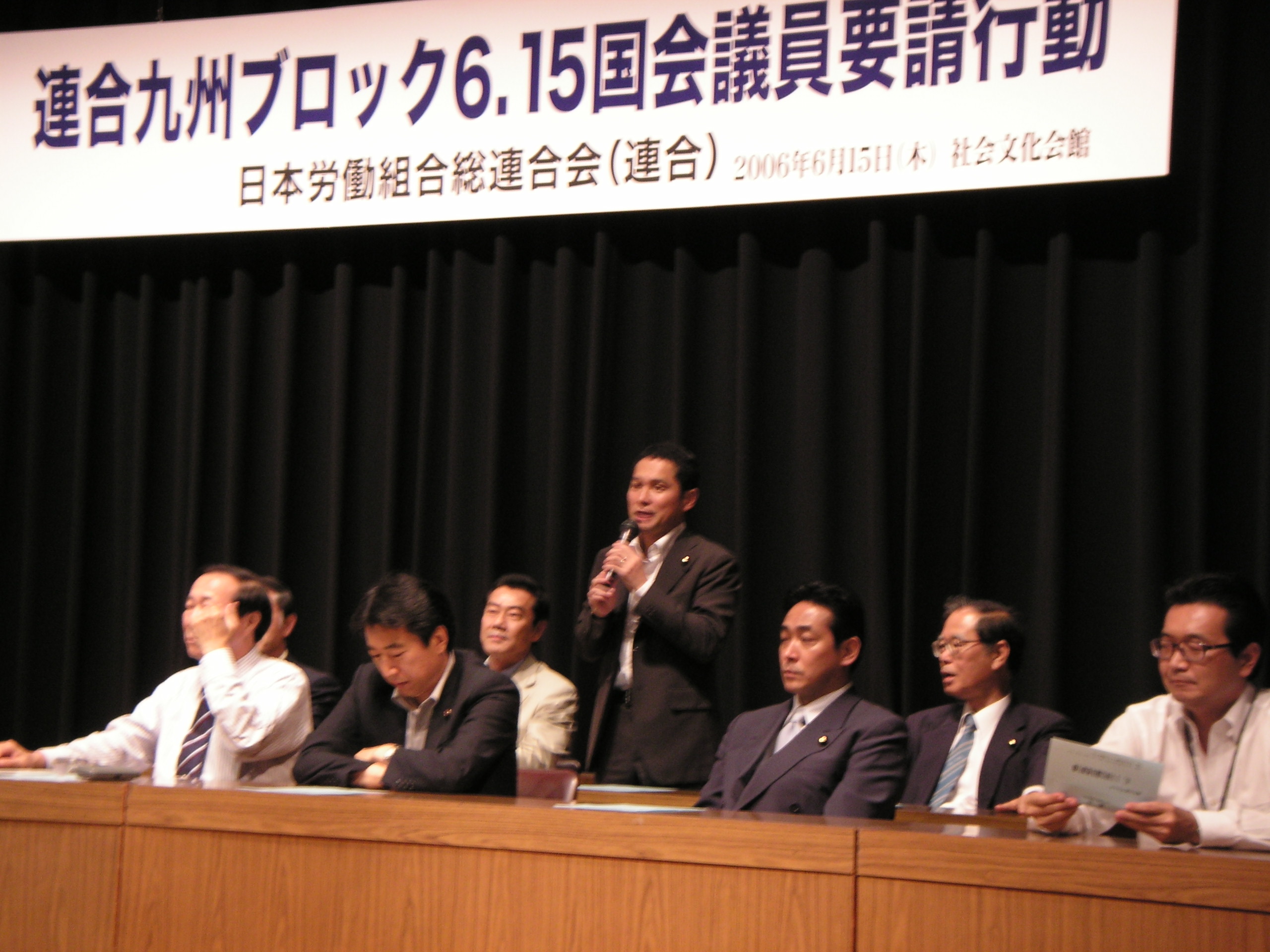 午後は衆議院本会議に出席したあと、本日、全国の連合の地方支部の代表の方々が上京して、「6.15国会議員要請活動」を行われましたので、その九州ブロックの会合に、原口一博代議士をはじめその他の九州選出の国会議員の方々とともに出席して、九州からおいでになった連合の皆さんにご挨拶して、要望活動についてお話しを聞かせていただきました。(写真)