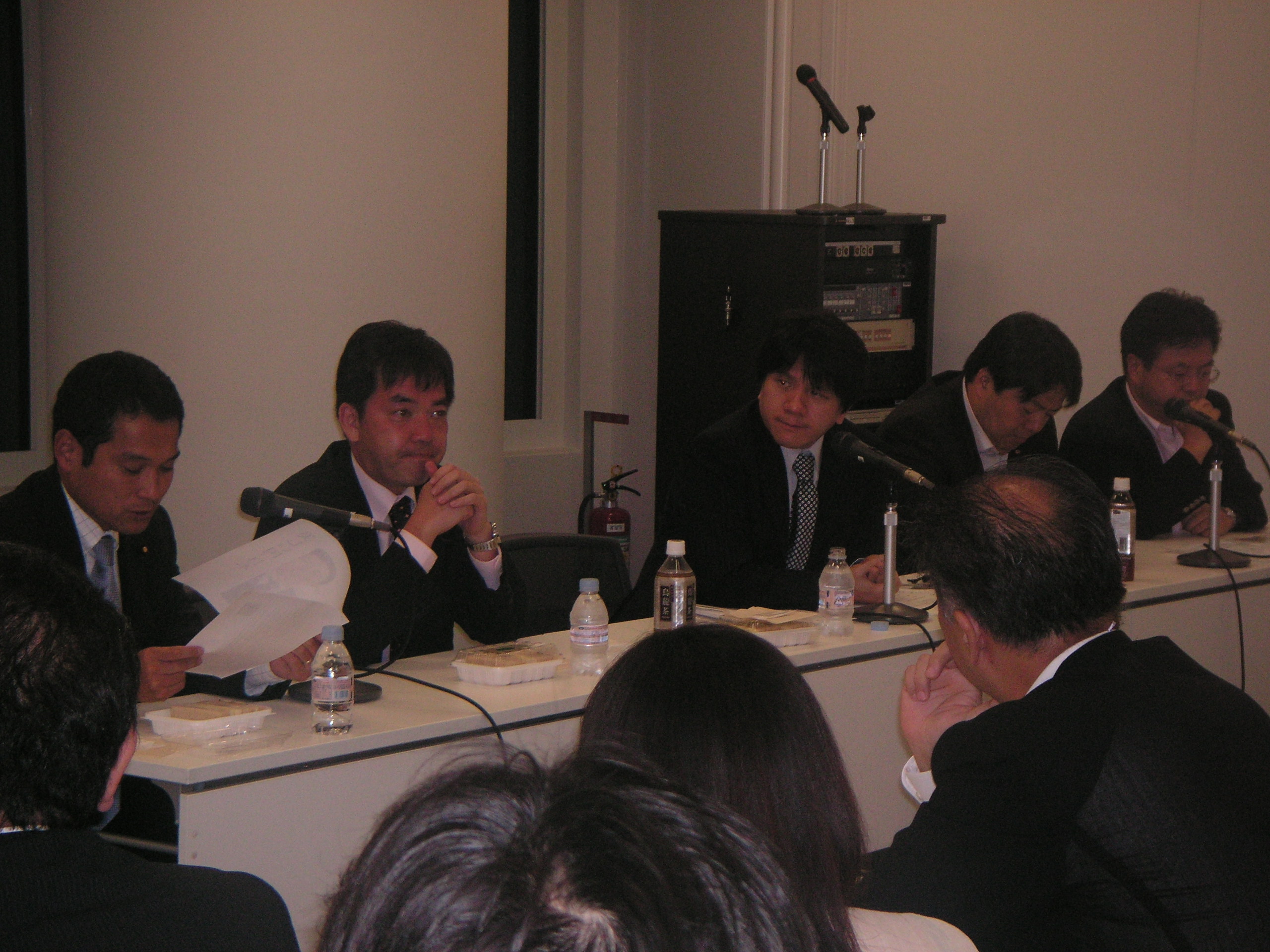 題材は「ポスト小泉時代の政治・経済・外交~日本の針路はどこに~」ということで、自民党からは、若手きっての政策通・林芳正参議院議員、郵政選挙の際の広報戦略を取り仕切り、かつ安倍氏側近の世耕弘成参議院議員、そして民主党からは「次の内閣」外務大臣の浅尾慶一郎参議院議員と、両党の若手リーダーの中で、なぜが私だけ一年生議員が混じって参加。