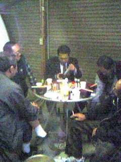 途中で、ある支援者のお宅に伺った際、家からではなくシャッターを下ろした車庫の中から、ワイワイガヤガヤという声が聞こえてきます。「こんにちは~」と声をかけると、「誰じゃいきたばい」と、ガラガラとシャッターが開いて、そこでは家の主人の方とその仲間の方々が、車庫の中で即席の新年会を開いていらっしゃいました。皆さん常日頃から熱く支援してくださっている方々で、私もその新年会に飛び入りしてワイワイガヤガヤ。(写真)