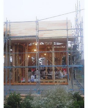 夕刻には、白石町で今日「建て家」のお祝いを行っていらっしゃったお宅に招かれて、ご挨拶をさせていただきました。(写真:分かりにくい写真ですが、建物の中でお祝いをしているのですよ)