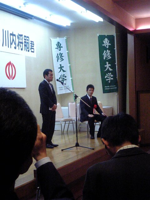 また、夜は、鹿島市で開催された、川内まさつぐ選手壮行会に出席(写真)。川内選手は北京オリンピックにボクシング選手として出場することが決まっている鹿島出身の若者。