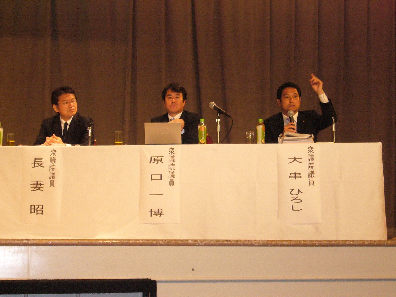 今日は、テレビなどでもおなじみの長妻昭代議士に、佐賀に来てもらって、年金、後期高齢者医療制度、そしてより広く税金のムダづかいの問題についての、講演会を開催しました。私も原口一博さん、川崎みのるさんとともに、パネルディスカッションに参加。