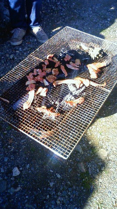 私もお宅ごとにお邪魔させていただいて、軒先でいのししの焼肉をいただいたりしながら(写真)、お話しをさせていただきました。