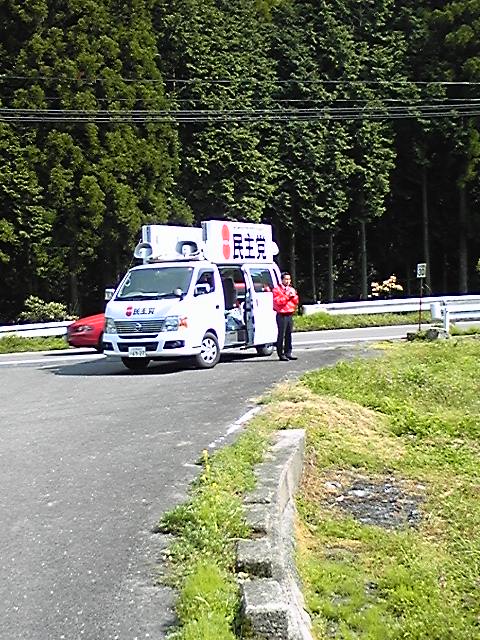 北部の山間部を中心に、街宣と辻立ちという組み合わせでした。まさに山に向かって叫ぶ、という感じの辻立ち。山に反射して声も響き渡ります。