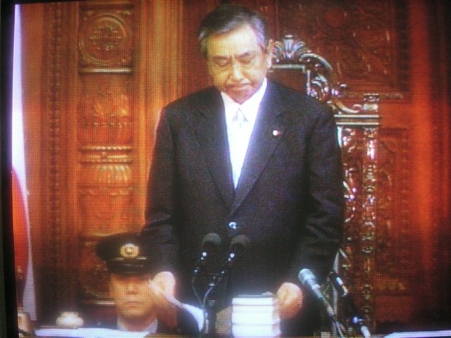 午後一時、開会のベルが鳴る。河野衆議院議長が入場する。それを全議員が拍手で迎える。皆が着席したあと、いわゆる解散詔書が議長に手渡される。