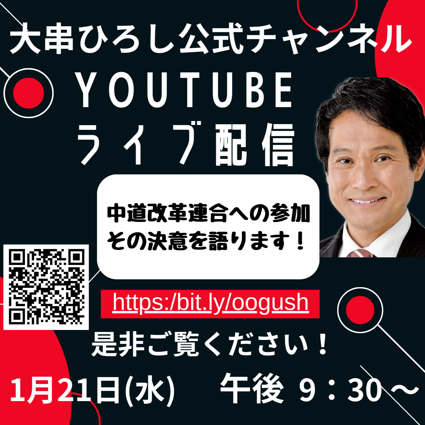 1月21日(水)本日、21時30分からYouTubeライブを配信します。「中道改革連合への参加、その決意を語ります!」がテーマです。